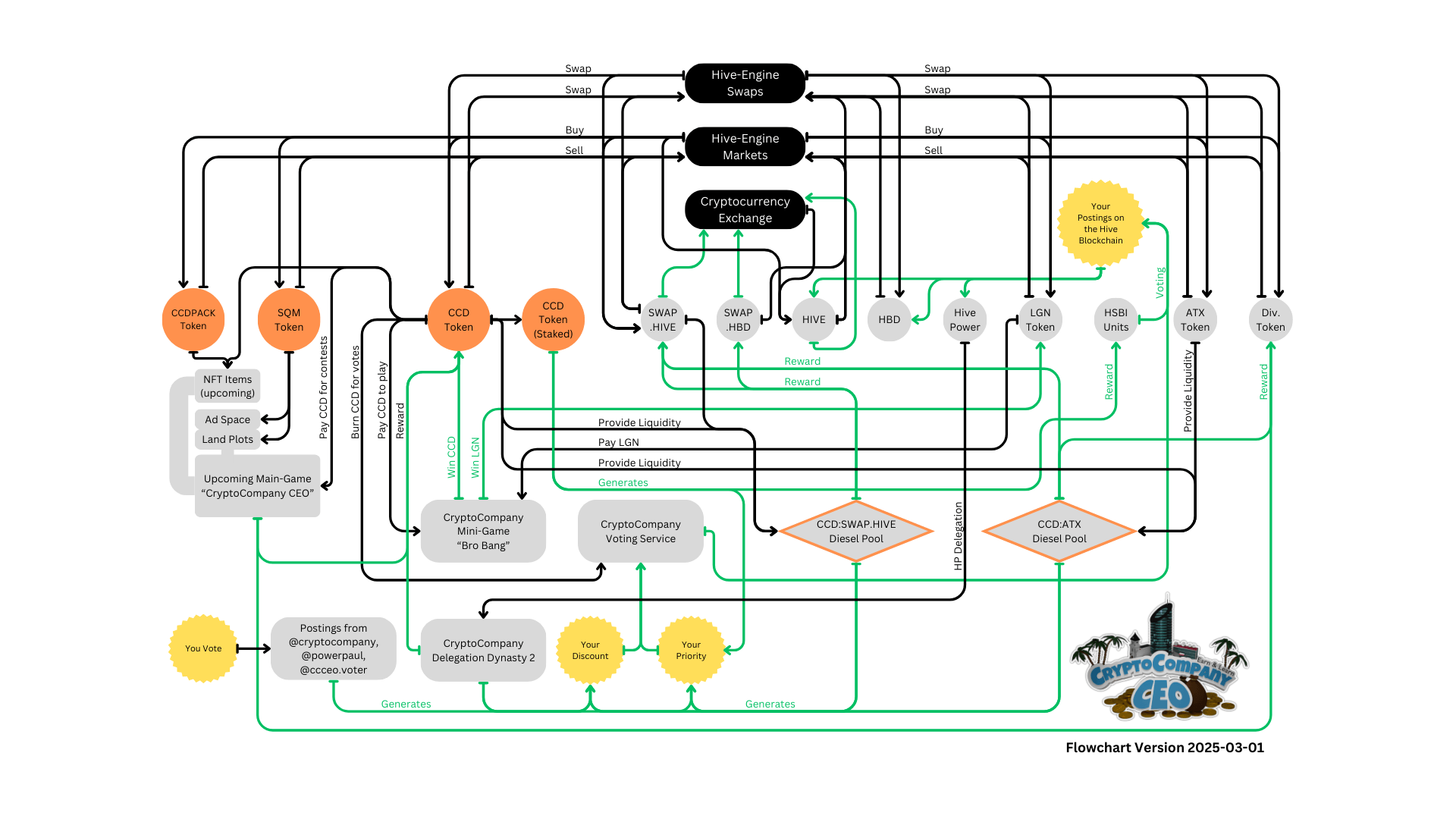 Organise CCD, publish a posting (for example in relation with #cryptocompany) and use the CryptoCompany Voting Service. With the rewards you can buy more CCD. Even better: delegate Hive Power to Delegation Dynasty 2 to receive more CCD every day. Spend a portion of this in the Voting Service, stake a second portion CCD to generate your daily HSBI. Place a third part in the CCD:SWAP.HIVE and/or CCD:ATX Diesel Pool.
